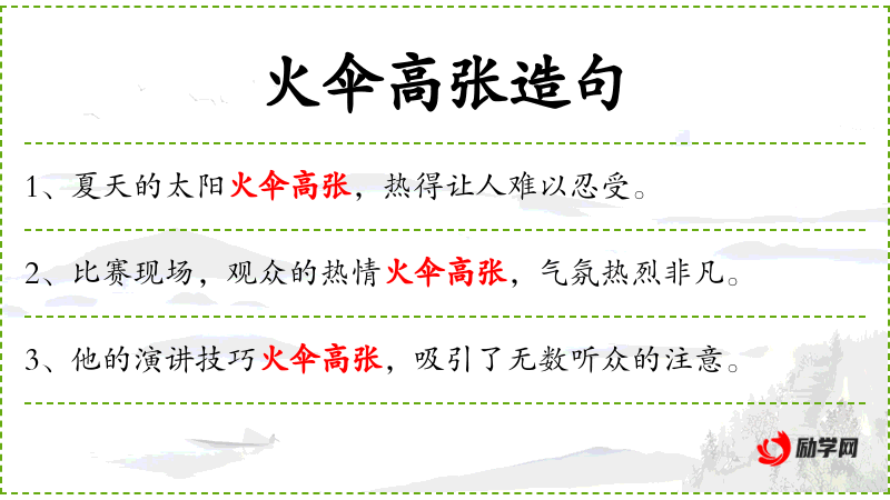3. 【火伞高张】 - 火伞:比喻夏天太阳酪烈;张:展开。形容夏天烈日当空,十分炎热。