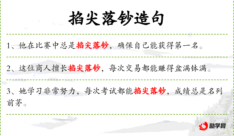 - 掐尖落钞:这是一个成语,意思是抓住关键,确保利益最大化。