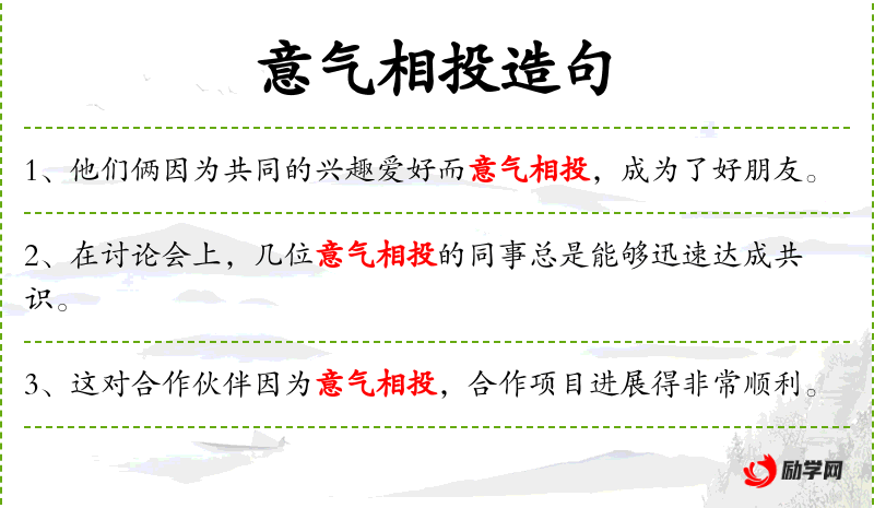 4. 【意气相投】 意气:志趣性格;投:合得来。指志趣和性格相同的人,彼此投合。