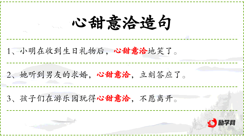 - 心甜意洽:形容词短语,形容心情愉悦、满意。