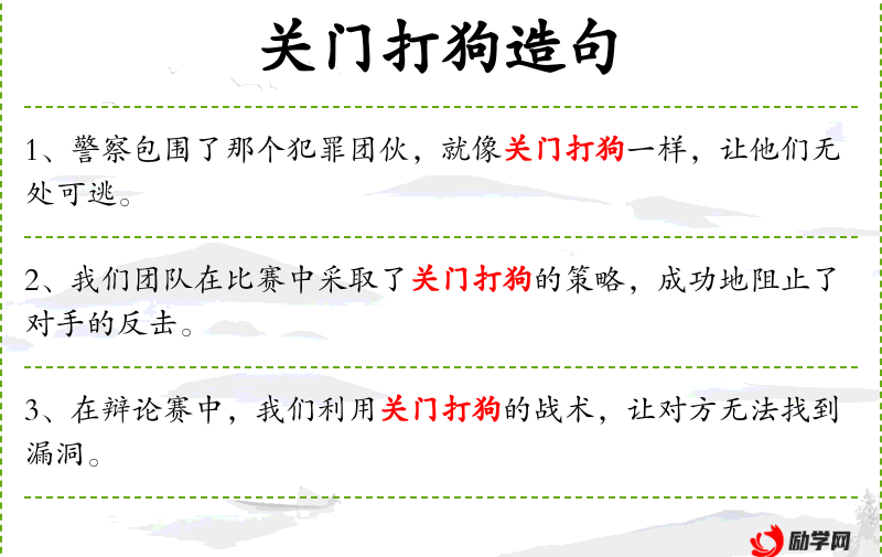 - 关门打狗:成语,比喻采取严厉措施对付特定对象。