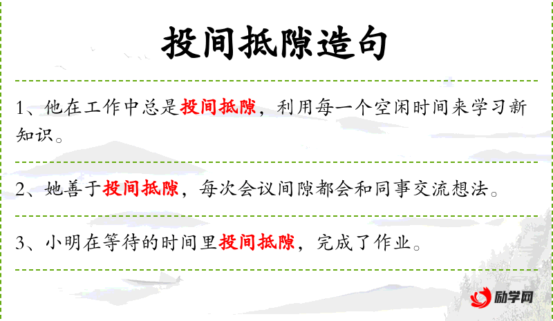 - “投间抵隙”这个成语源自《左传·僖公二十三年》,意为利用空隙,这里用来形容学生巧妙利用时间。
