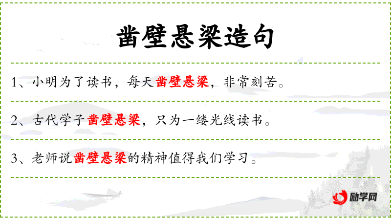 - 凿壁悬梁:a metaphor for hard work and dedication, often used to describe the efforts of ancient scholars who studied under difficult conditions