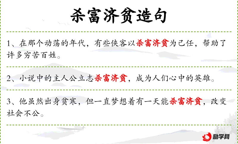1. 【杀富济贫】 - 杀掉那些为富不仁的人,向穷人提供救济和帮助。