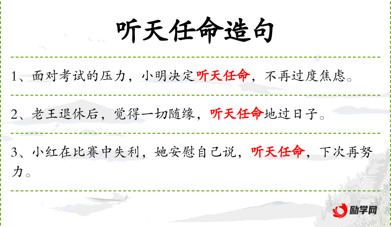 - 听天任命:成语,表示接受命运的安排,不强求。