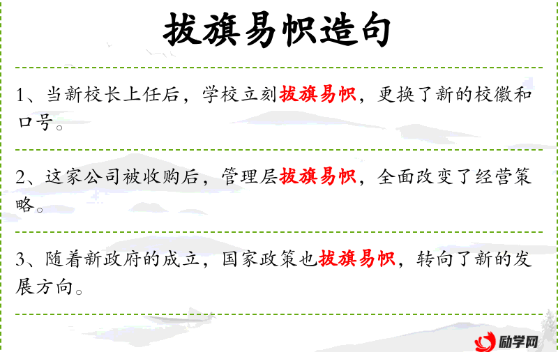 - 拔旗易帜:原指军队更换旗帜,比喻改变立场或方向。