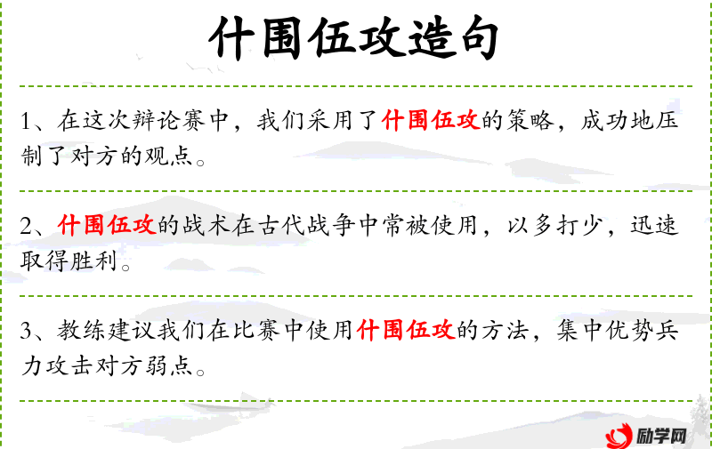 - “我们在这场辩论赛中,通过运用什围伍攻的策略,有效地削弱了对方的观点。”
