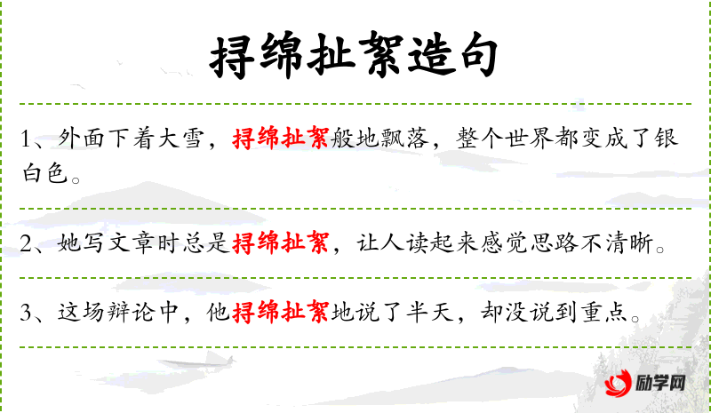 - 挦绵扯絮:形容说话啰嗦、冗长,缺乏重点。
