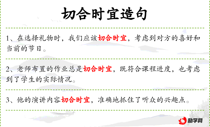 - 切合时宜:成语,表示符合当前的情况或需要。