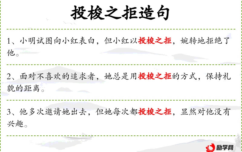 在实际交流中,这种表达方式体现了礼貌和尊重。使用“投梭之拒”和“婉转”这样的词汇,表明拒绝者不想伤害对方的感情,同时也传达了自己的立场。