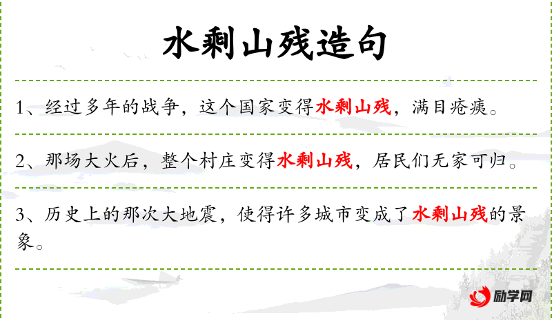 6. 【水剩山残】 多指亡国或经过变乱后国土分裂、山河残破的景象。