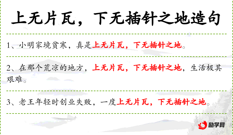 句子中的“上无片瓦,下无插针之地”是传统的成语,用来形容极端的贫穷。这个成语反映了文化中对贫穷的深刻认识和描述。