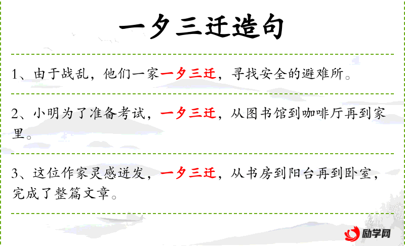 1. 【一夕三迁】 一夜之间三次迁移。形容居住的地方极不安全,令人提心吊胆,不得安宁。