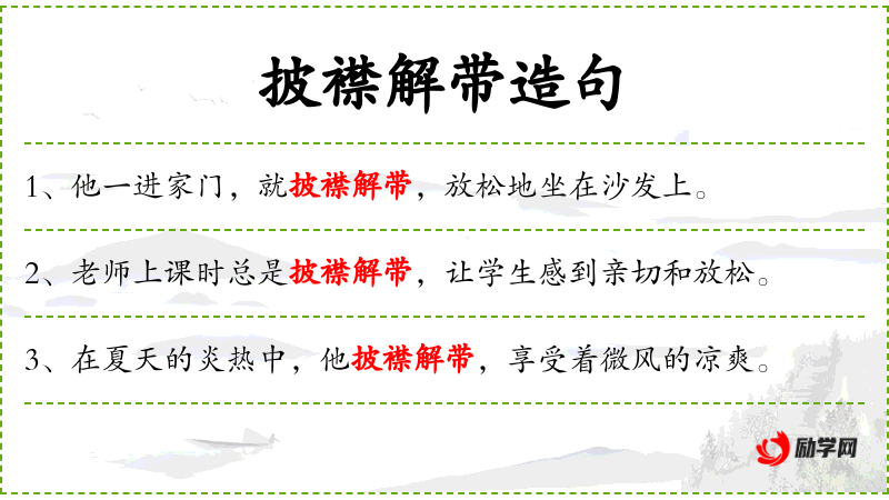 - 相关成语:“披襟解带”本身是一个成语,原意是指解开衣襟,这里比喻老师放松的状态。