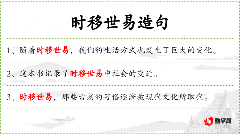 - 时移世易:这个成语反映了**文化中对时间流逝和事物变化的深刻认识。