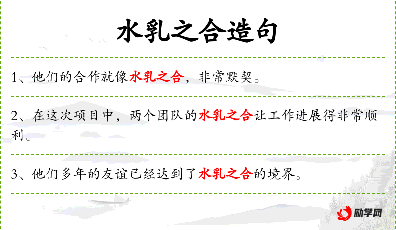 3. 【水乳之合】 指水和奶汁融合为一体。形容关系密切,意气投合。