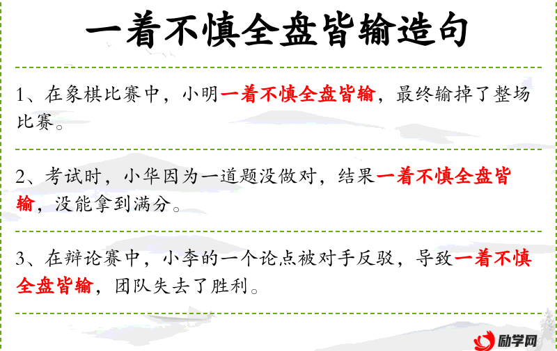 2. 【一着不慎全盘皆输】 一着: 下棋时下一子或走一步叫一着。原指下棋时走错关键的一步, 以致全局输掉。比喻对一个关键性问题处理不得当, 就会招致整个事情失败。