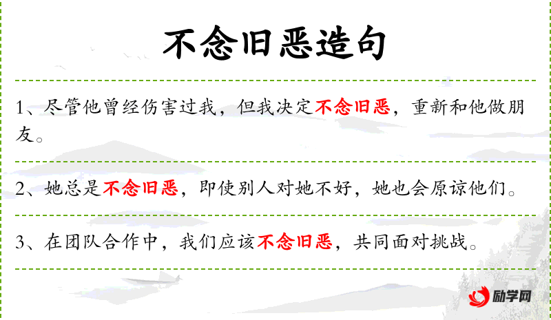 - 不念旧恶:成语,表示不计较过去的仇恨或不愉快。