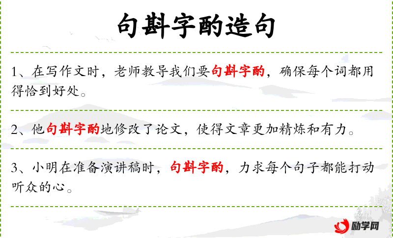 - 句斟字酌:成语,形容写文章或说话时非常慎重,反复推敲。
