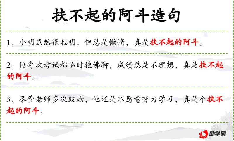 句子中的“扶不起的阿斗”涉及历史文化,与三国时期的蜀汉后主刘禅有关。这个成语反映了人对于领导者和个人责任的一种文化期待。