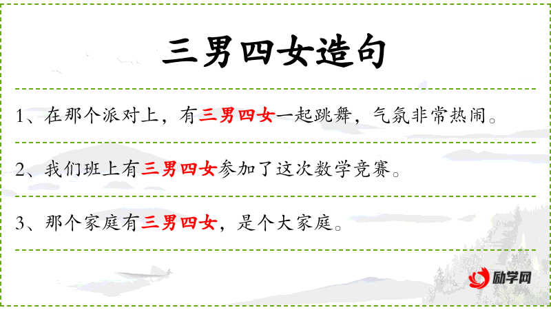 - 三男四女:数量词组,表示小组的性别和人数构成。