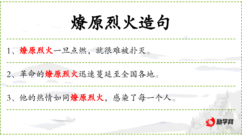 3. 【燎原烈火】 - 好像大火在原野上燃烧,使人无法接近。比喻不断壮大,不可抗拒的革命力量。