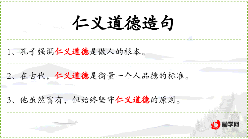 - 仁义道德:儒家思想中的核心概念,“仁”指爱人,“义”指正当的行为,“道德”指行为准则和规范。