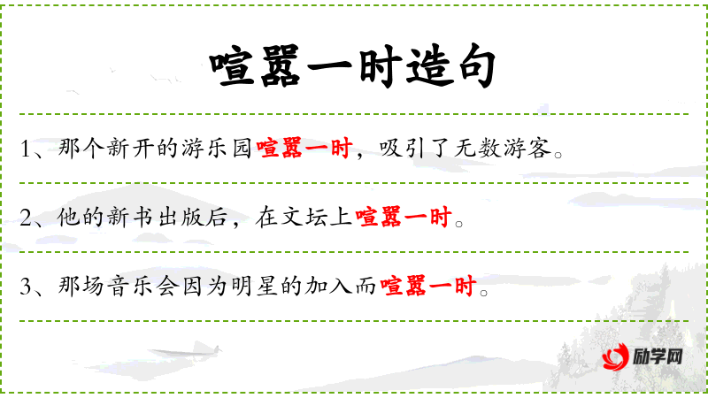 - 喧嚣一时:成语,形容某事物在一段时间内非常引人注目或热闹。