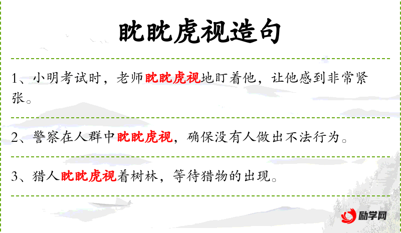 7. 【眈眈虎视】 眈眈:注视的样子。像老虎那样凶狠地盯着。