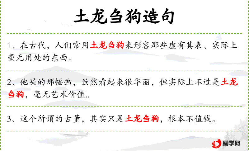 - 土龙刍狗:这个成语源自**古代,用来形容无用或不值一提的东西。