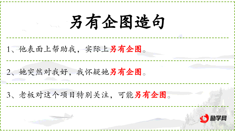 - 另有企图:别有用心、图谋不轨