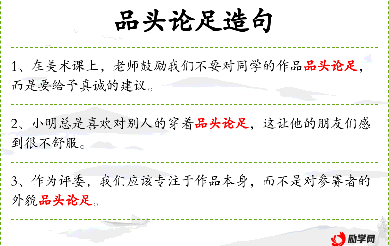 句子:“在学校的辩论赛中,选手们应该专注于论点,而不是对对方的言辞品头论足。”