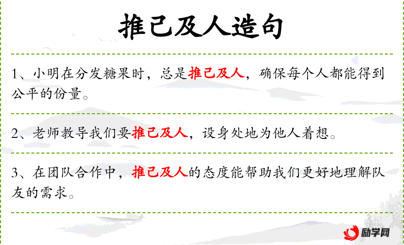 - 推己及人:指从自己的立场和感受出发,考虑他人的立场和感受。