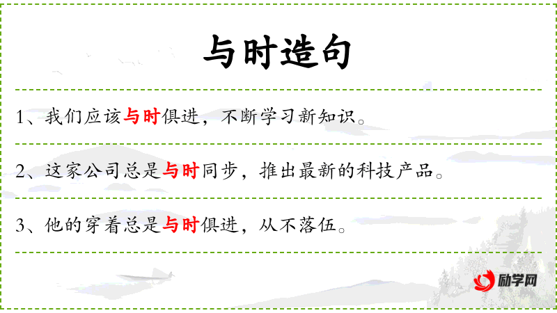 1. 【与时俱进】 是指准确把握时代特征,始终站在时代前列和实践前沿,始终坚持解放思想、实事求是和开拓进取,在大胆探索中继承和发展。