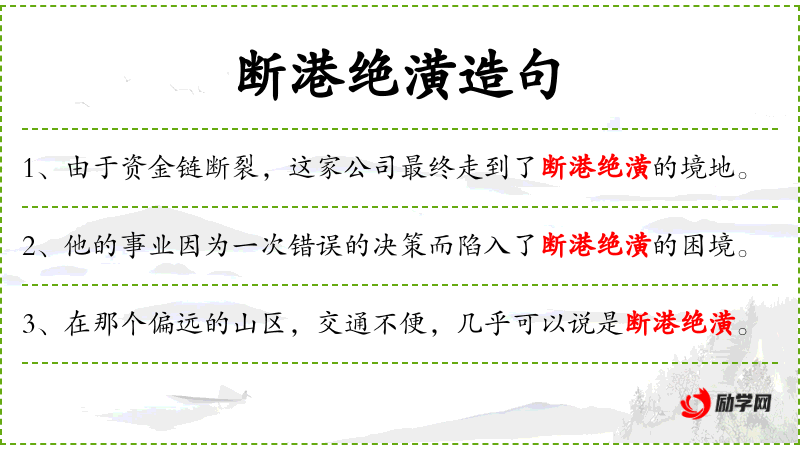 - 断港绝潢:这个成语来源于古代航海,指船只无法返回港口,比喻事情无法挽回。