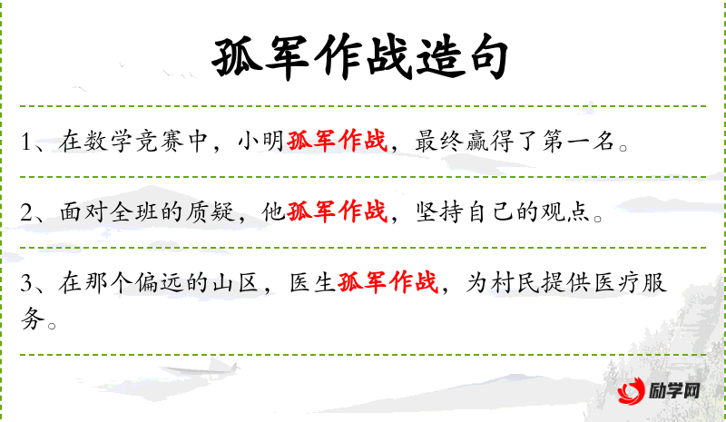 - 孤军作战:这个成语源自军事用语,比喻在没有外援的情况下独自面对困难。