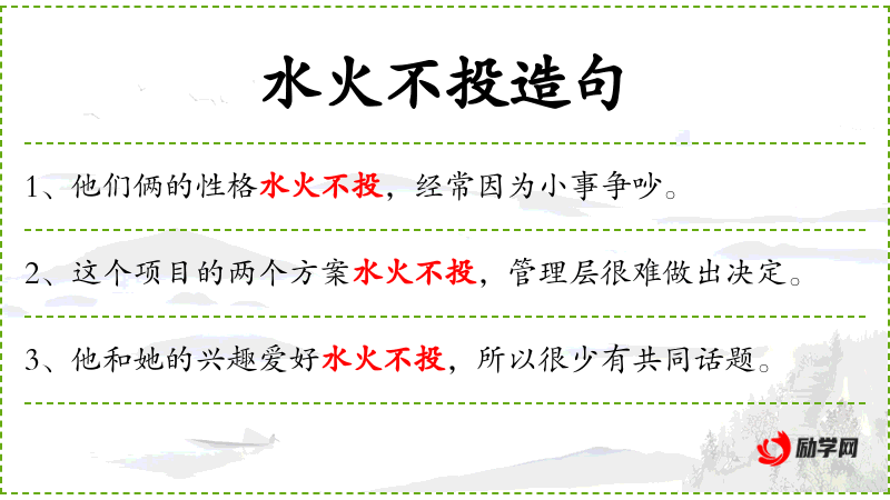 1. 【水火不投】 水和火是两种性质相反的东西,根本不相容。比喻二者对立,绝不相容。