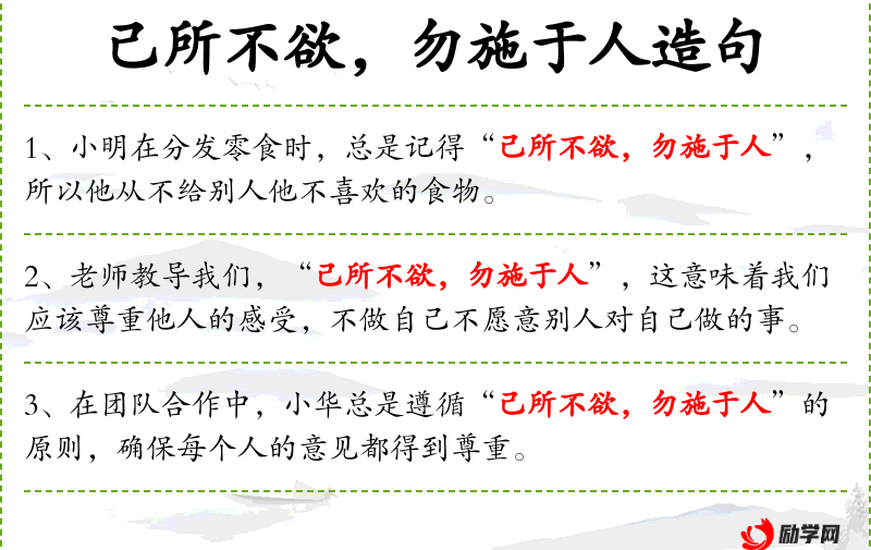 - 己所不欲,勿施于人:一种道德准则,意为不要对别人做自己不愿意被做的事情。