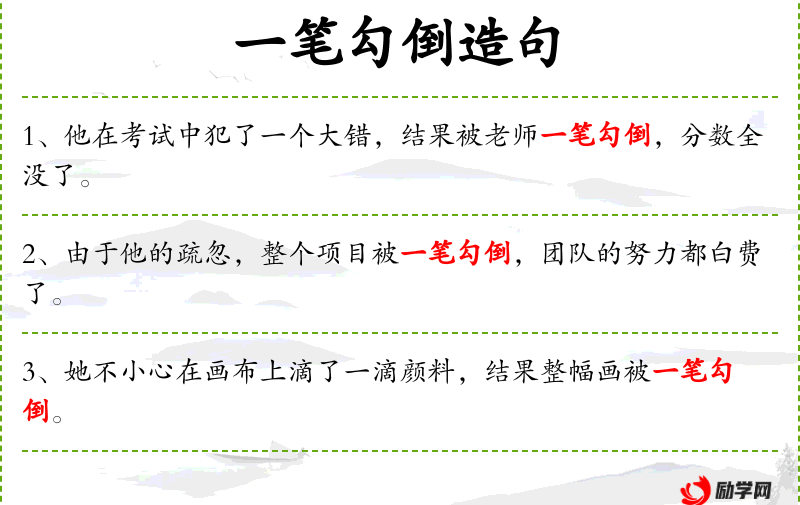 1. 【一笔勾倒】 - 把账一笔抹掉。比喻把一切全部取消。