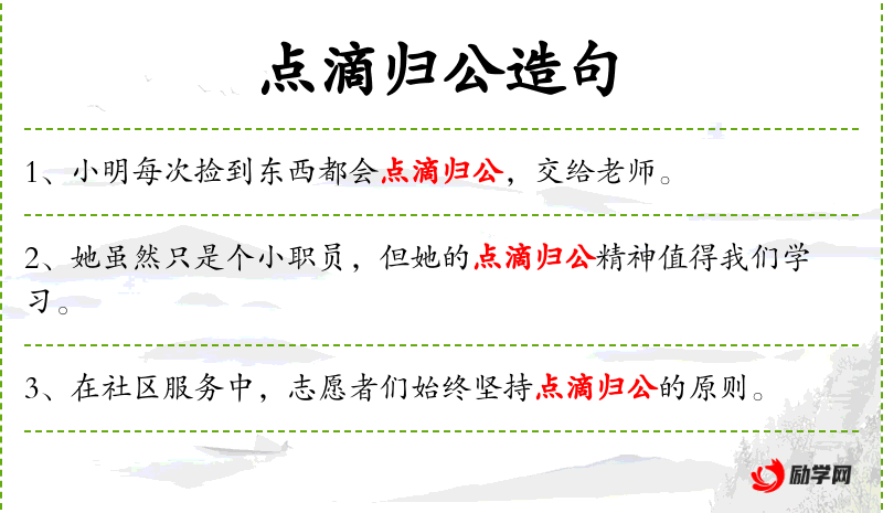 1. 【点滴归公】 - 指公家的钱财一点一滴都归还公家,丝毫不浪费或私用。