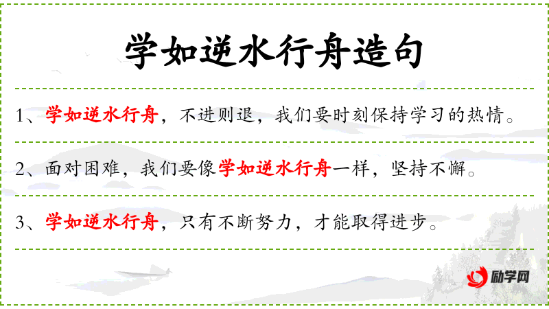 1. 【学如逆水行舟】 学习就像在逆水中行船一样,不前进就势必后退。