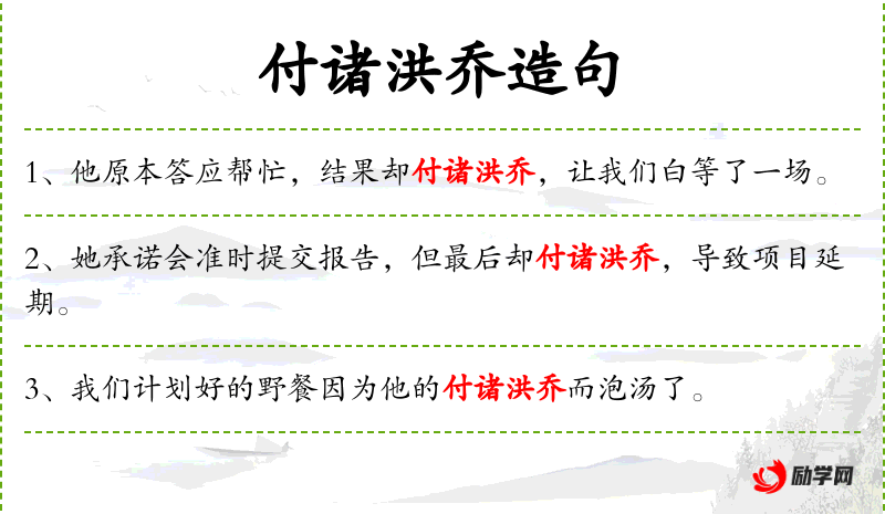 - 成语:“付诸洪乔”是一个**成语,源自《左传·僖公二十五年》,原意是将重要事务托付给不可靠的人,这里比喻未能履行承诺。