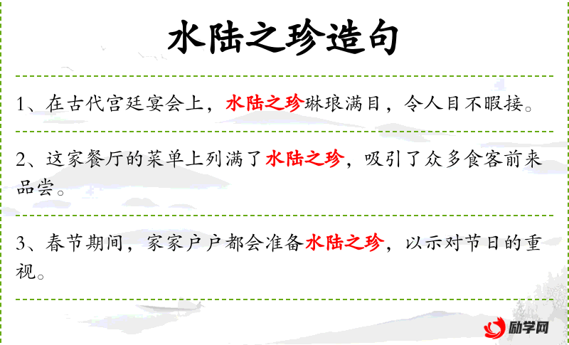 1. 【水陆之珍】 - 水陆:指水陆所产的珍贵食物。指美味佳肴。