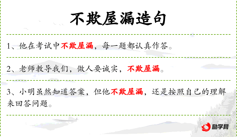 - “老师告诫我们,诚实是做人的基本原则,即使在屋漏之处也不应欺骗。”