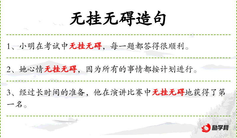 - 无挂无碍:成语,形容做事顺利,没有阻碍。