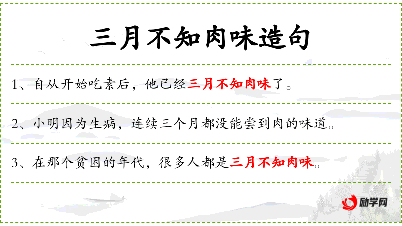1. 【不知肉味】 - 原指被美妙的音乐所陶醉,因而辨不出肉味。后形容专心学习,吃东西辨不出味道。也形容生活困难,无肉可吃。
