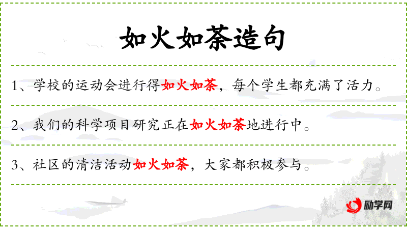 - 如火如荼:形容事情进行得非常热烈、旺盛。