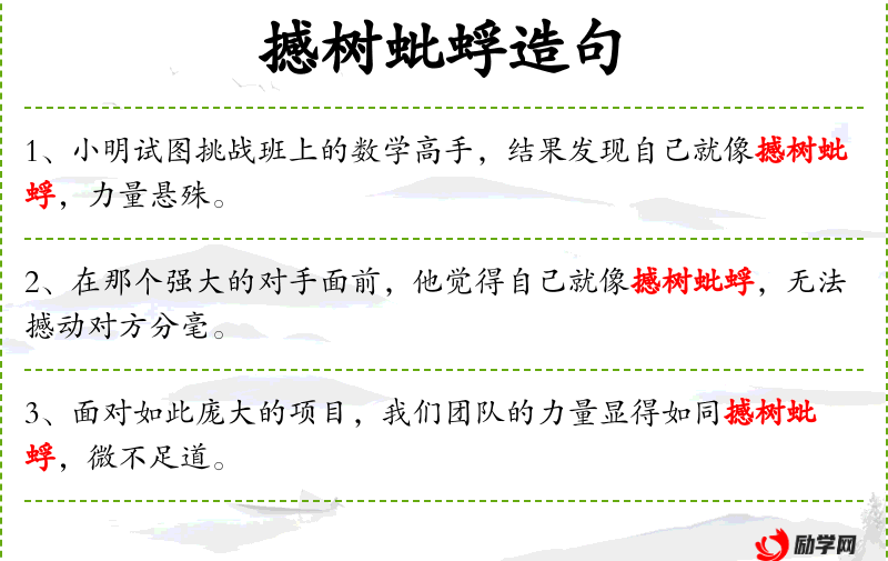 - 撼树蚍蜉:比喻力量微小,无法撼动大树的蚍蜉
