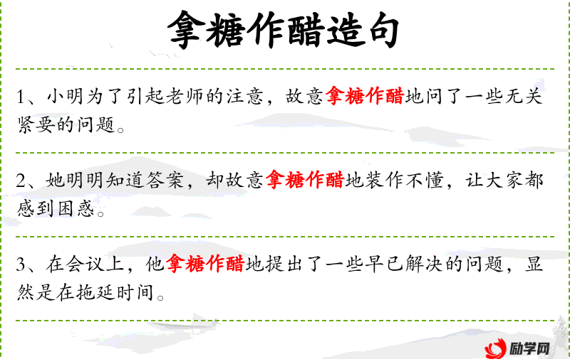 - 成语:拿糖作醋,源自**传统文化,比喻故意夸大或歪曲事实。