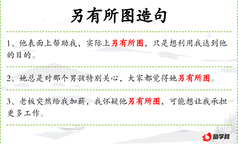 - 成语“另有所图”在**文化中常用来表示某人行为背后有其他的目的或动机。